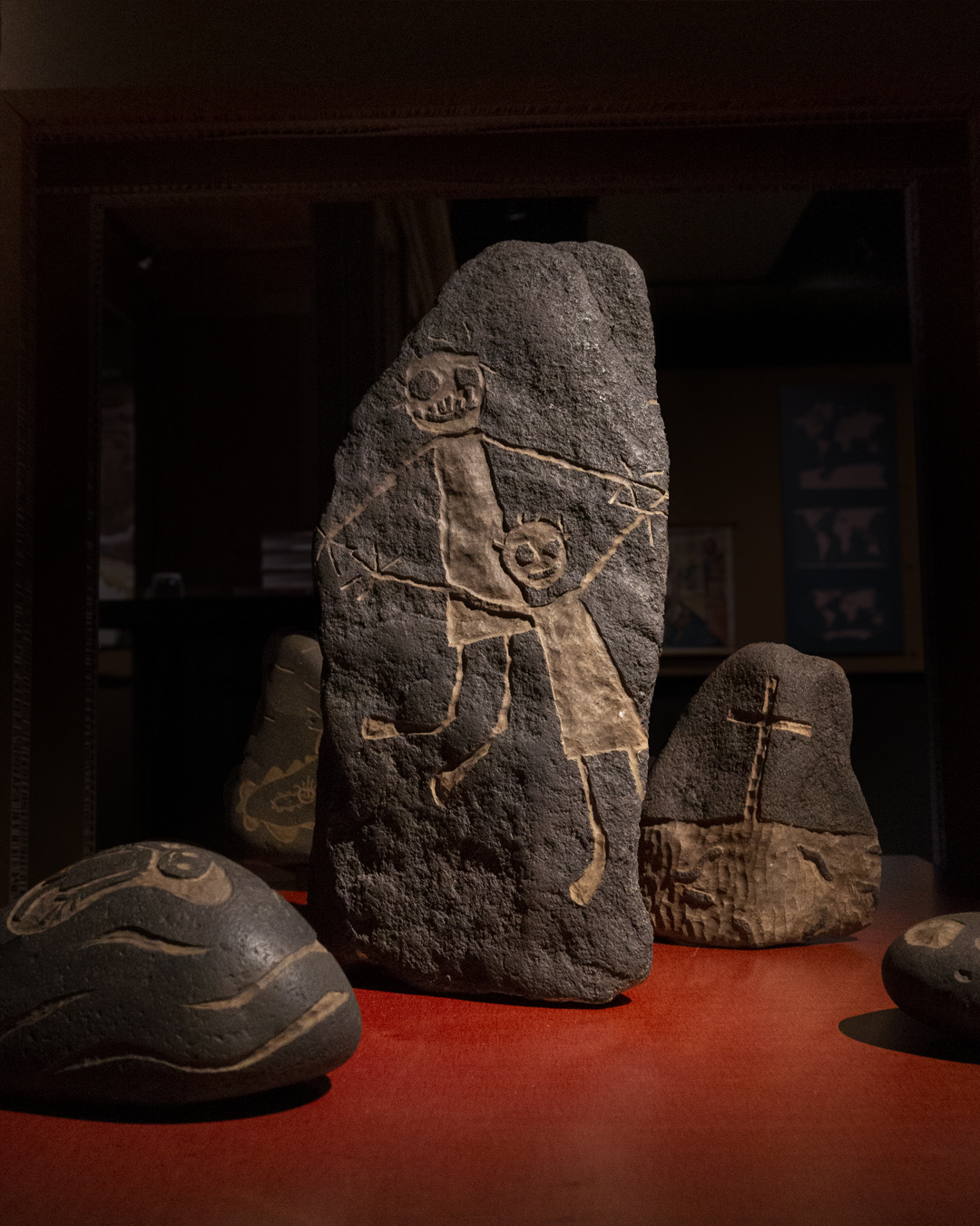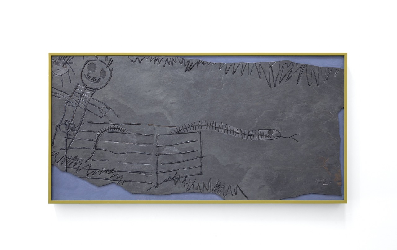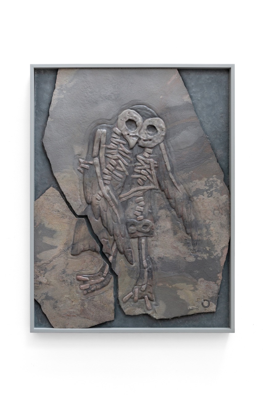 Fossil Plaque (04), 2022, natural slate stone, polymer clay, acrylic resin and wooden frame, 101 x 201 x 12 cm