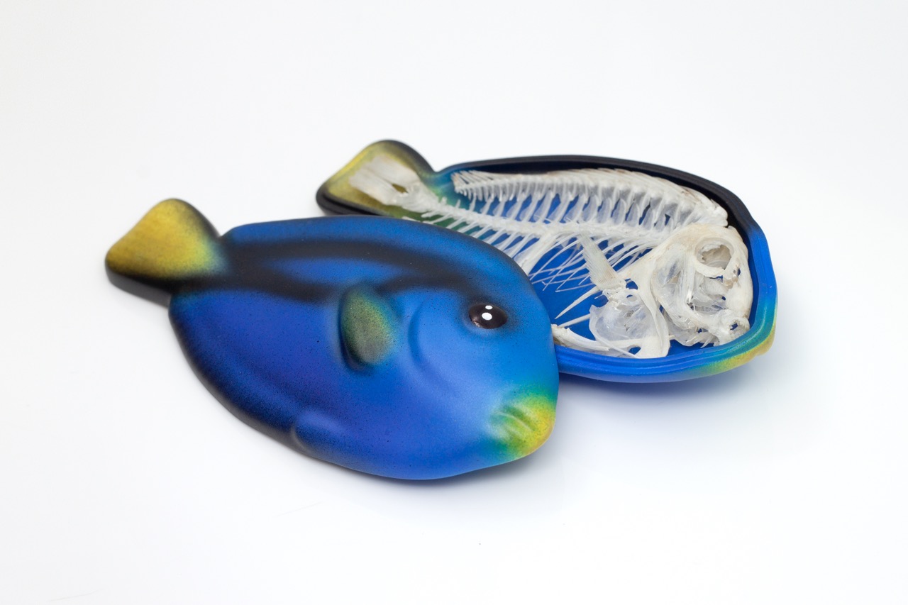 Dory, 2023, Paracanthurus hepatic skeleton, resin print and airbrushed acrylics, 10 x 5 x 3 cm (closed sarcophagus), 4 x 2 x 1 1/8 in (closed sarcophagus)